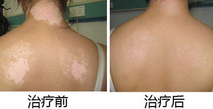 治疗强化阶段:白斑边缘或中间出现毛囊性黑点,体内黑色素细胞明显增多,病变部位黑色素沉着由周围慢慢向中间聚集,白斑面积逐渐向中间缩小。小面积的白斑可完全恢复,大面积的白斑可恢复皮损面积的70%。
