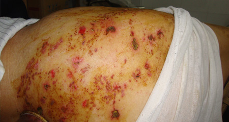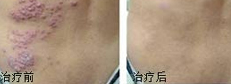 治疗前:腰上可见很多小水疱,少数有破裂糜烂,常有烧灼和痛痒感。
