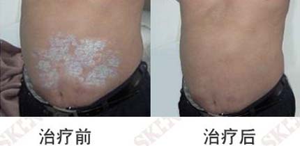 病程:7岁在腰部出现脱屑情况,后经检查发现为牛皮癣,治疗十余年均不见好转,今年3月来我院接受治疗,采用中药方剂进行固本培元,加大药熏及药浴,后期进行综合光疗和治疗。