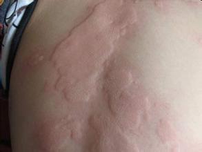 2、荨麻疹:荨麻疹俗称风疹块,通常表现为鲜红色或苍白色的风团,往往间歇发作。