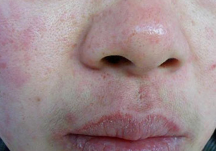 临床表现:面部皮肤潮红,毛细血管扩张,期间有散在的丘疹,脓丘疹,与酒糟鼻相似,还有的可表现为口周皮炎。