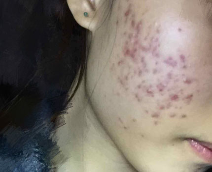 18岁那年,患者脸上开始冒出青春痘。当时,以为是平时不注重保养,才会长青春痘。紧接着,保湿的、紧肤的、祛痘的化妆品一股脑地买了回来。那些化妆品使用后,青春痘的症状不但没有缓解,反而更加严重,左右脸及额头上都长满了。红痘摸起来疼,整张脸看起来就像被“八宝粥”泼过。