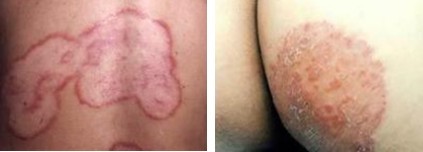 临床表现:本病夏秋季节多发。体癣和股癣临床特点类似。体癣:初起时有鳞屑的红色斑片,境界清楚,皮损边缘不断向外扩展,中央趋于消退,形成境界清楚的环状或多环状,自觉瘙痒,可因长期搔抓刺激引起局部湿疹样改变或浸润肥厚呈苔藓样变。
