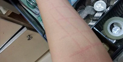 也称皮肤划痕症,可单独发生或其他型荨麻疹同时存在。往往先感到局部皮肤瘙痒,搔抓后出现与划痕一直的线状风团。衣服紧压处,如紧束的腰带、袜带、袖口等处也可出现风团。停止刺激后风团很快消失。